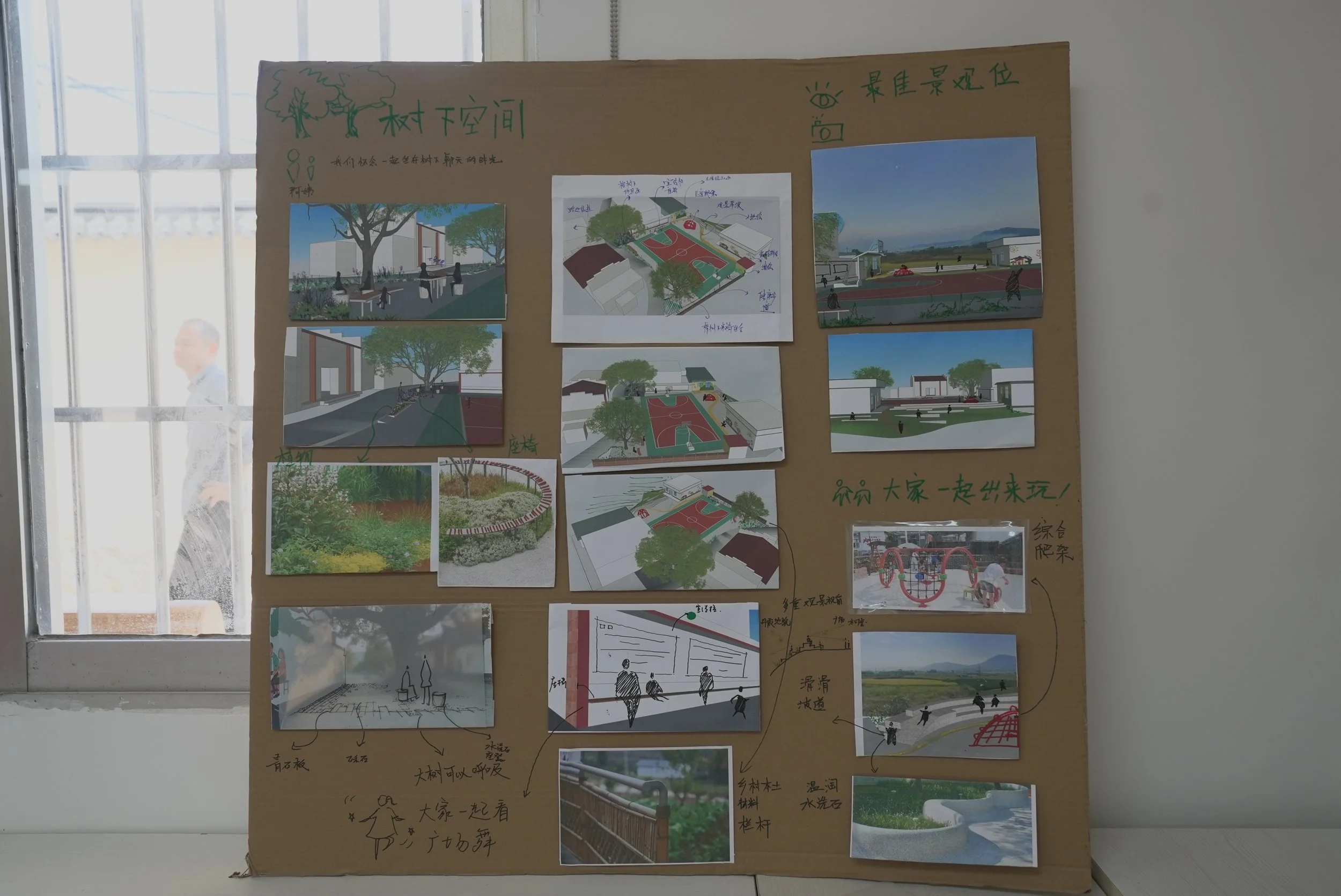 Participants were particularly drawn to the far end of the basketball court, where a metal fence had been installed. In the previous plan was to add a covered seating area, but discussions revealed that the community’s seating preferences extended beyond just facing the basketball court. Many locals expressed a desire to sit facing the other direction, overlooking the expanding rice fields and the scenic Danxia_ mountain. Together, we explored possibilities for a design feature that would provide seating in both directions without obstructing the view.