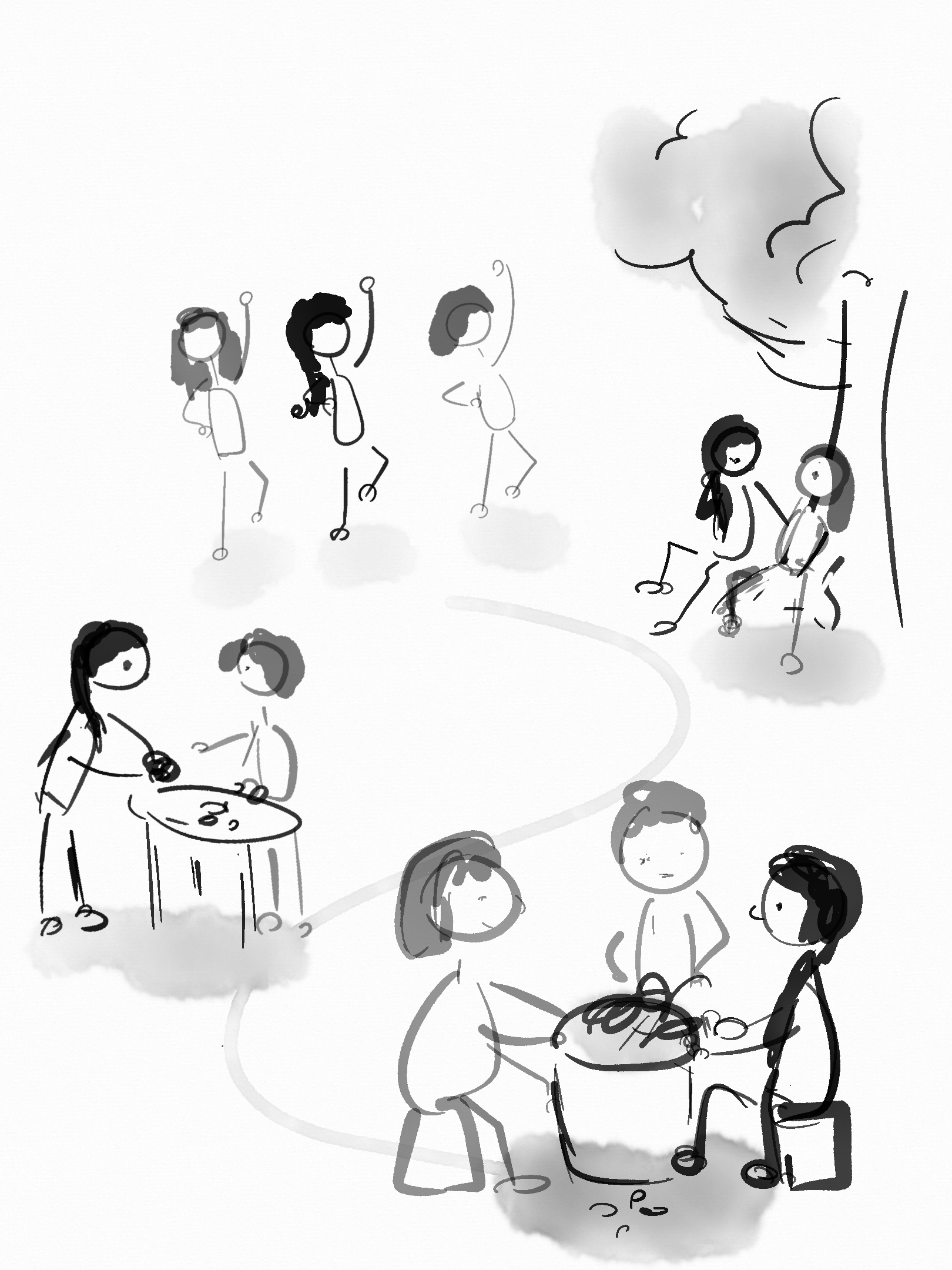 (Lights shift to warm daylight and ambient village sounds: chatter, clinking bowls, distant laughter.)